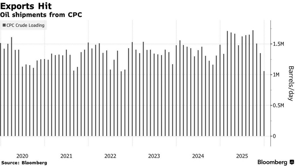 По данным Bloomberg, в декабре отгрузки нефти сорта CPC Blend упадут до 800–900 тысяч баррелей в сутки. Это на 45% ниже, чем планировали в середине месяца. Трейдеры сообщают, что из 45 запланированных к отправке судов отменили как минимум 21.