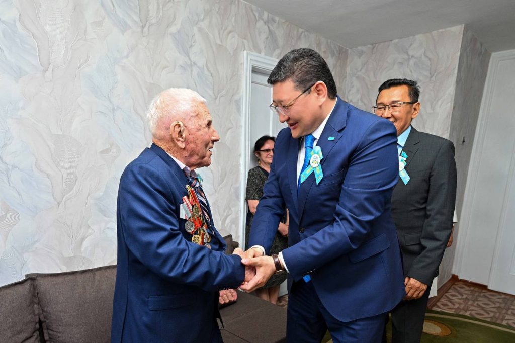 Облыс әкімі әуелі 104 жастағы соғыс ардагері, «Халық қаһарманы» Әбдіғали Қаймолдиннің шаңырағына барды. Әбдіғали Қаймолдин 1941 жылы әскер қатарына шақырылып, 1945 жылдың 9 мамырына дейінгі аралықта Сталинград, 1-Украина, 1-Беларусь, 3-Балтық майдандарына қатысады. Харьковті азат етуге атсалысады. 2023 жылы Мемлекет басшысы Қасым-Жомарт Тоқаевтың Жарлығымен 1941–1945 жылдардағы Ұлы Отан соғысында көрсеткен ерлігі, батылдығы, жанқиярлығы мен соғыстан кейін мемлекеттік және қоғамдық қызметке белсенді қатысқаны үшін «Халық қаһарманы» атағын беріліп, айрықша ерекшелік белгісі – Алтын жұлдыз және «Отан» орденімен марапатталды.