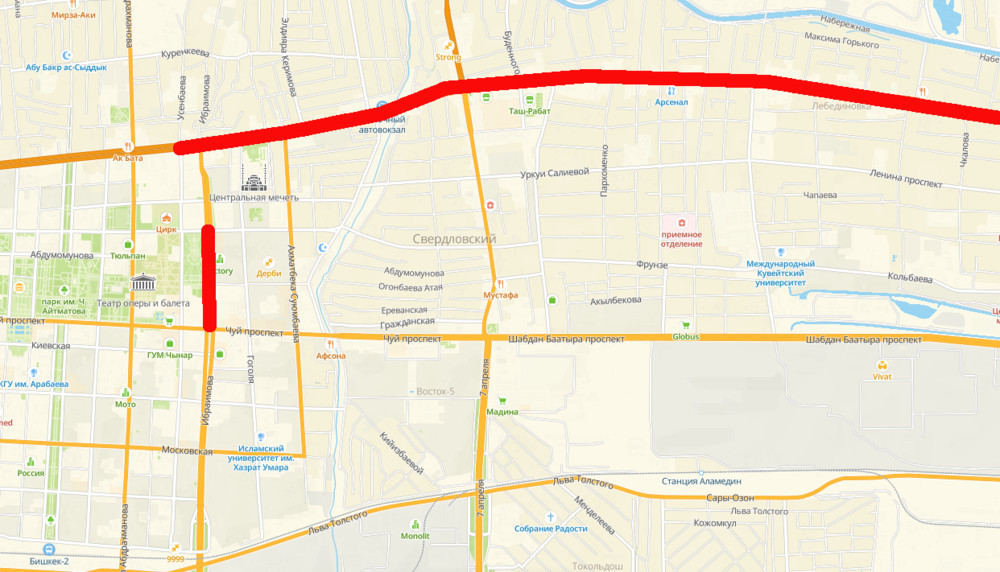 – Шопоков жана Ибраимов көчөлөрүнүн кесилиши, Чүй проспектисинен Фрунзе көчөсүнө чейин.