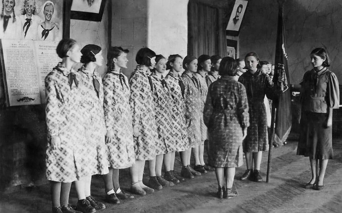 Уникальное фото. 1941 год. За отличную комсомольскую работу Красногвардейский райком ВЛКСМ г. Ленинграда награждает организацию детского дома № 46 Красным Знаменем. Знамя принимает старшая пионервожатая Лидия Костина.