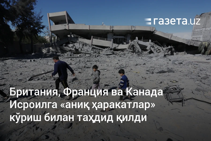 Буюк Британия ва Канада бош вазирлари ва Франция президенти қўшма баёнотда Исроил Ғазодаги операцияни тўхтатмаса ва ёрдам етказиб беришга қўйилган чекловларни бекор қилмаса, «аниқ ҳаракатлар» кўриш билан таҳдид қилди, деб ёзмоқда BBC.