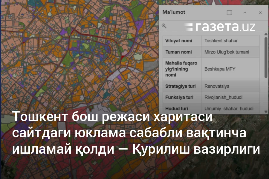 Душанба куни эса Қурилиш ва уй-жой коммунал хўжалиги вазирлиги харита ёпиб қўйилмаганини маълум қилди. «Тошкент шаҳри бош режаси ҳаволасига киришда юклама ортгани сабабли расмий сайтда узилишлар кузатилмоқда. Ушбу ноқулайлик учун узр сўраймиз ва тез орада муаммо бартараф этилишини маълум қиламиз», — дейилади хабарда.