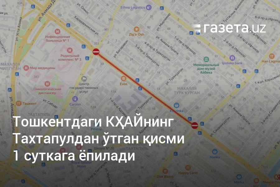 Тошкент шаҳридаги Кичик ҳалқа автомобиль йўлининг Тахтапул дарвоза кўчаси кесишмасидан Ифтихор кўчаси кесишмасигача бўлган қисми 28 апрель соат 22:00 дан 29 апрель соат 22:00 гача ёпилади.