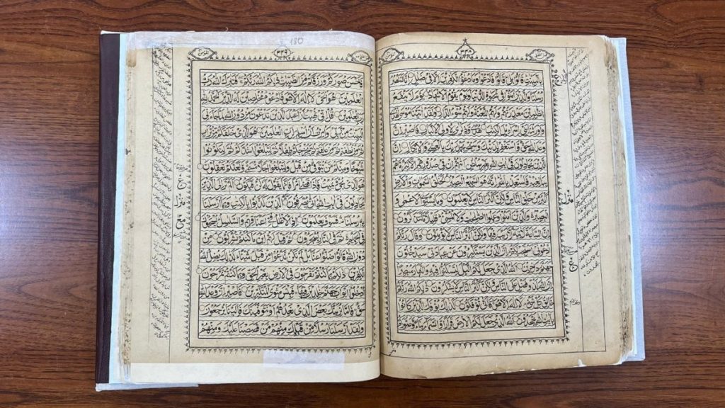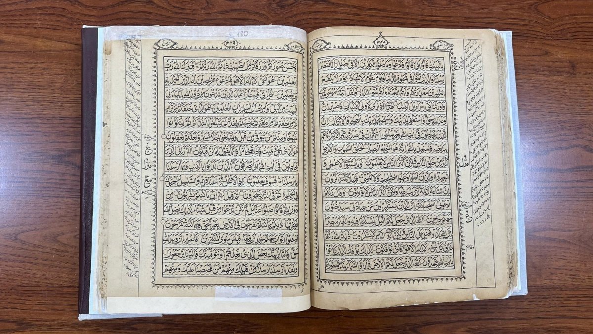 — Книга переплетена в кожу, аяты написаны растительным красителем. Известно, что Священный Коран — основная книга в Исламе. Путем чтения Корана совершается поклонение Аллаху. Коран — самая литературно богатая книга на арабском языке после Торы и Евангелия. Коран состоит из 114 сур, 6 236 букв, — говорит заведующая отделом хранения основного фонда библиотеки Гулдерайым Косназарова.